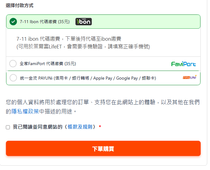 在網站選擇商品後,按照流程下單。支付方式請選擇7-ELEVEN 代碼繳費。