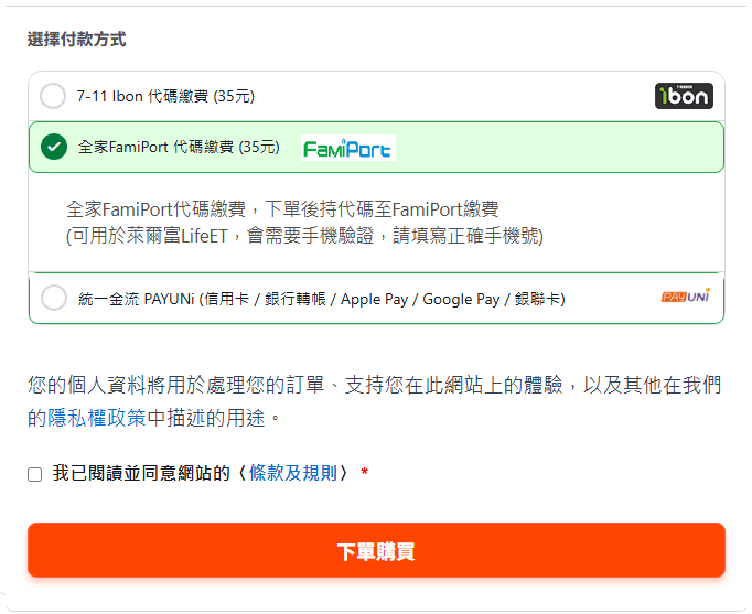 在網站選擇商品後,按照流程下單。支付方式選擇兩家超商任一。